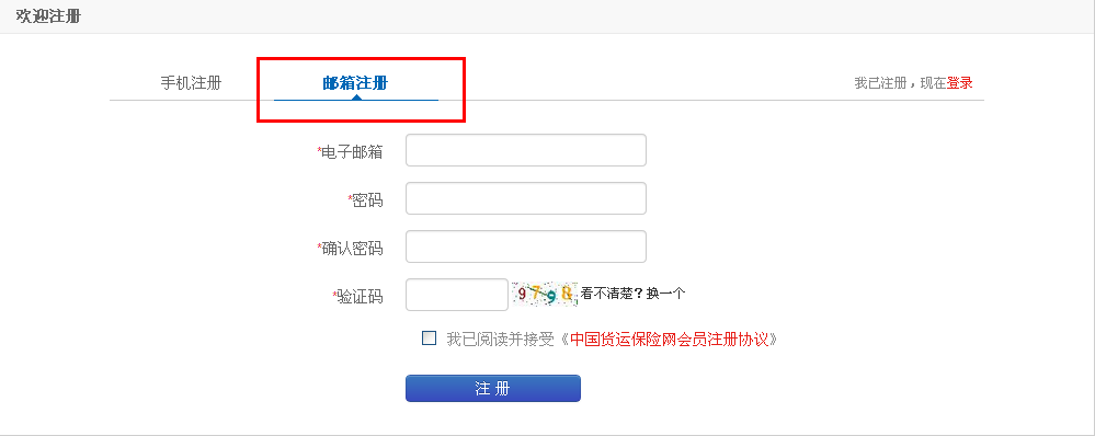 分别输入邮箱、密码、验证码后,点击“我已阅读并接受《中国货运保险网会员注册协议》”即可。